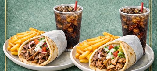 Warm, fluffy pita wrapped around tender, seasoned meat—choose savory gyro or juicy Chicken Avo—topped with crisp vegetables and creamy tzatziki. Served with golden, perfectly seasoned fries and a refreshing fountain drink. A satisfying Mediterranean lunch that’s fresh, flavorful, and made to keep you energized for the rest of the day.